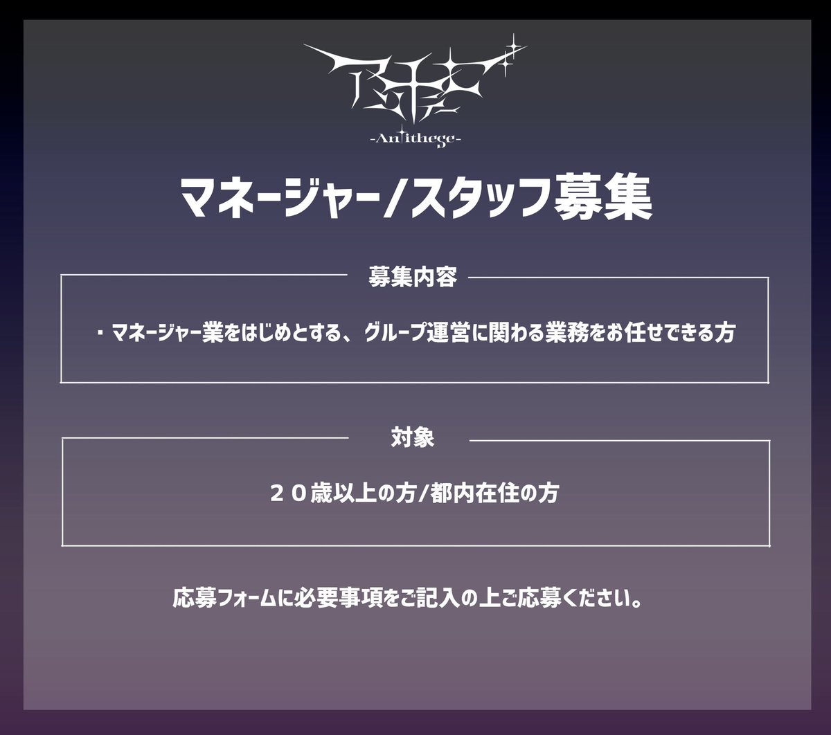 この度、アンチテーゼではマネージャー業をはじめとする、グループ運営に関わる業務をお任せできるスタッフを募集致します。